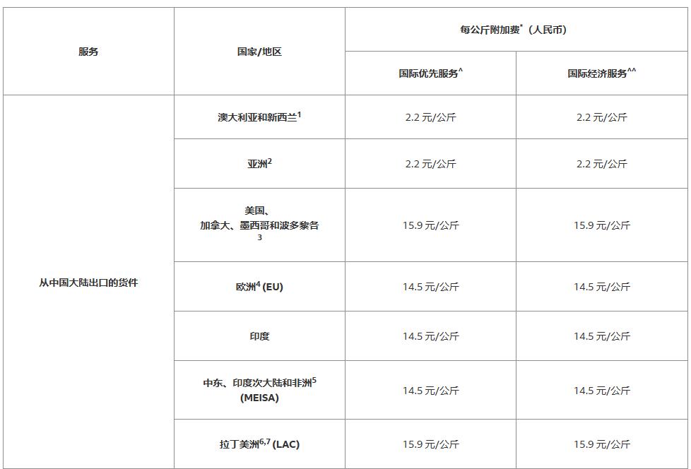 Fedex則計劃于9月16日起征繳需求附加費。Fedex方聲稱當運量增長、運力需求的增加、運營成本增加還有其運營網絡面臨別的壓力時,FedEx也許會收取需求附加費,詳細如下↓