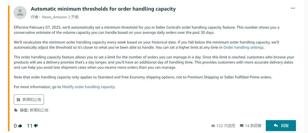亞馬遜在公告中表示,自2月7日起,將會在Seller Central的訂單處理能力功能中自動為賣家設(shè)一個最低閾值。該閾值是基于賣家過去30天的平均每日訂單量做出的保守估計,用于顯示賣家可以處理訂單的容量。